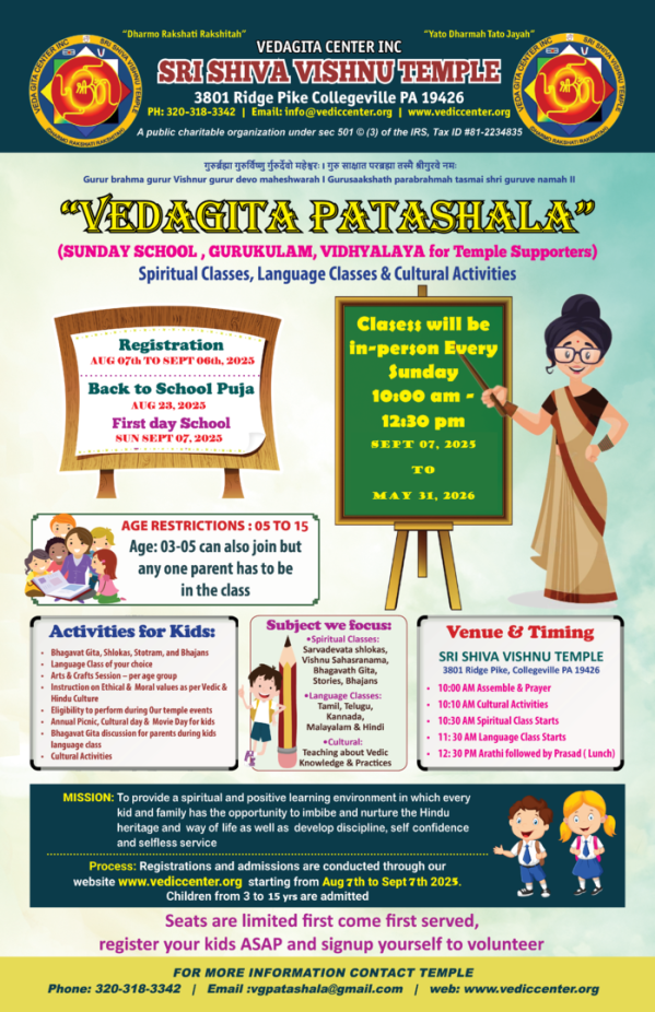 The temple spearheads in promoting the learning of our scriptures and Sanskrit language. Classes are held regularly to teach children and adults various slokas, stotras, Divyaprabandam, Tevaram, Telugu Sampradaya Stotras, Ramayanam, Bhagavatam etc. Also 05 Indian language classes for students and workshops are organized in the temple for children and adults. The temple also conduct Carnatic music, bharatanatyam & kuchipudi Dance classes on weekly basis. Please contact the temple at (320) 318‐3342 or email vgpatashala@vediccenter.org for more info.